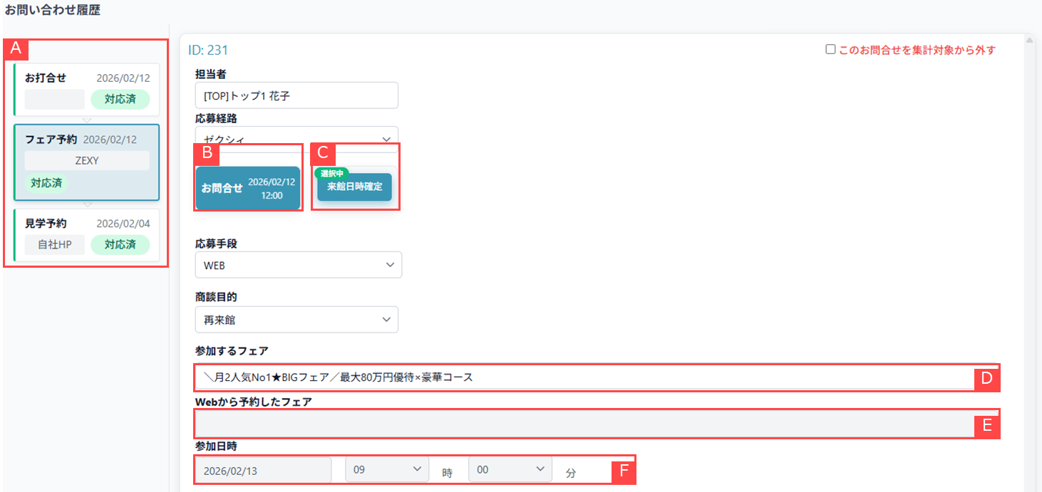 ④問い合わせ情報自動収集時に、Web予約されたフェア名が自動で入力されます。【D】
