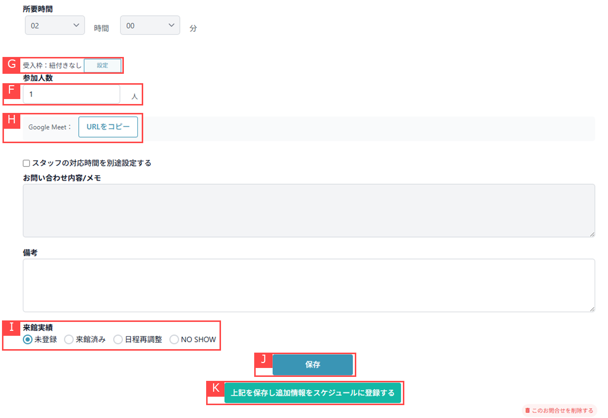 ⑥問い合わせ情報自動収集時に、Web予約された際の来館予定日時・人数が自動で入力されます。【F】