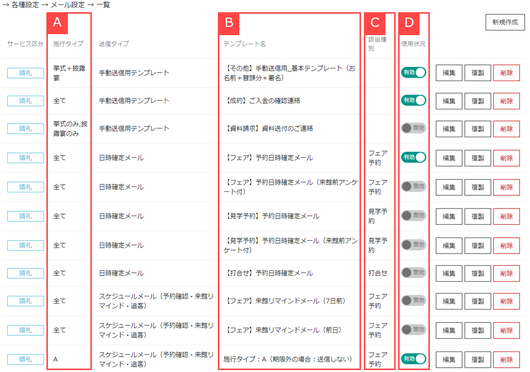 ③「該当種別」はどの申込に対して使用するテンプレートかが表示されます。【C】