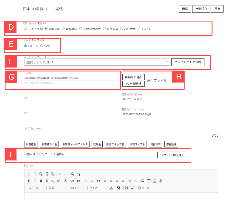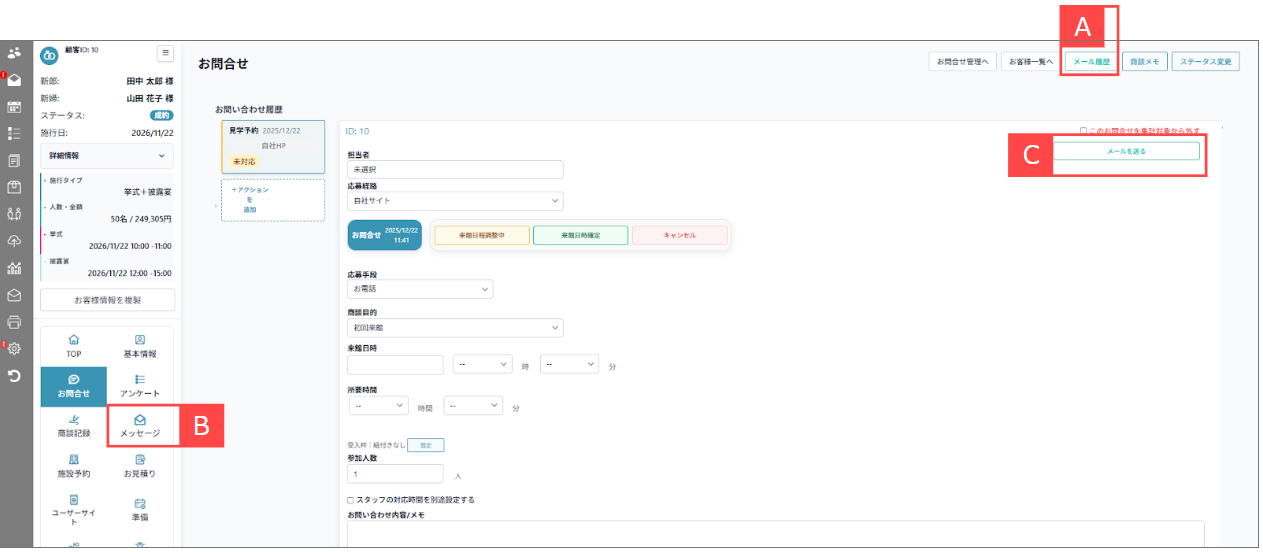 【お問い合わせ】の履歴の中からフェアや資料請求の際にメールが送れます。【C】