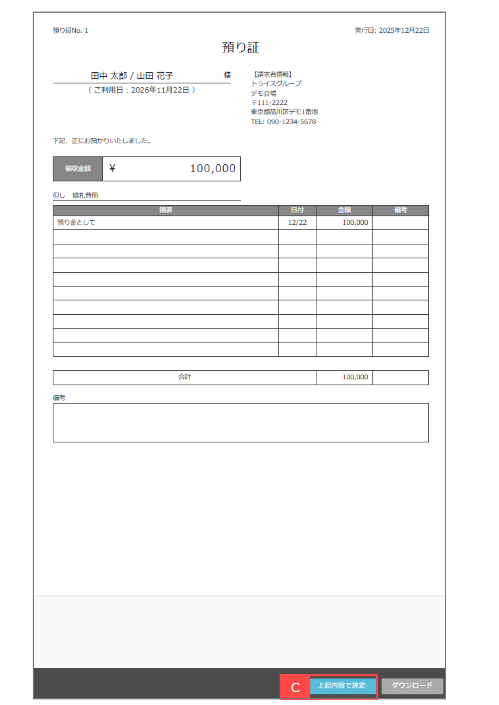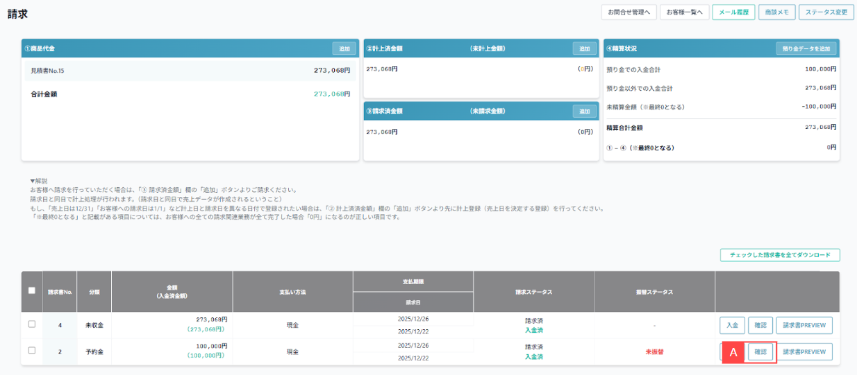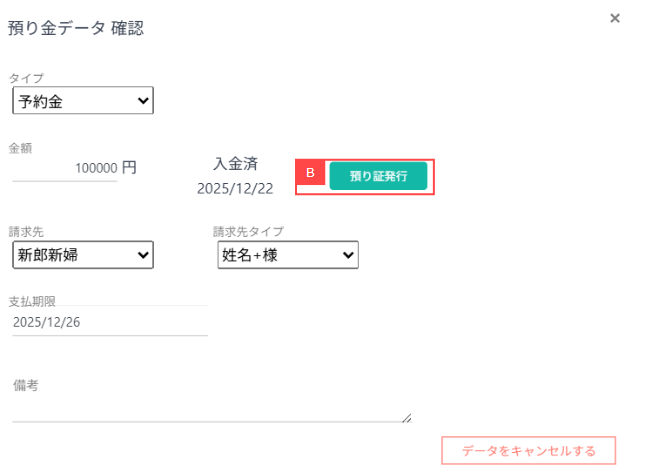 ②入金済みの場合「預り証発行」ボタンが表示されます。【B】