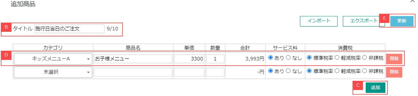 ②請求画面に表示する追加商品群のタイトルを設定できます。【B】