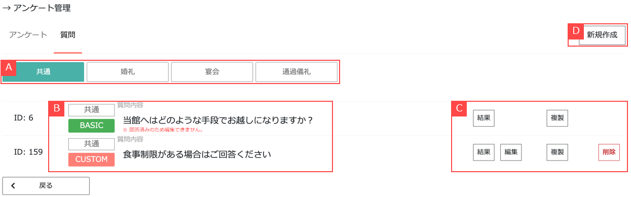 ②サービス区分(共通 / 婚礼 / 宴会 / 通過儀礼)ごとに質問項目一覧が表示されます【A】