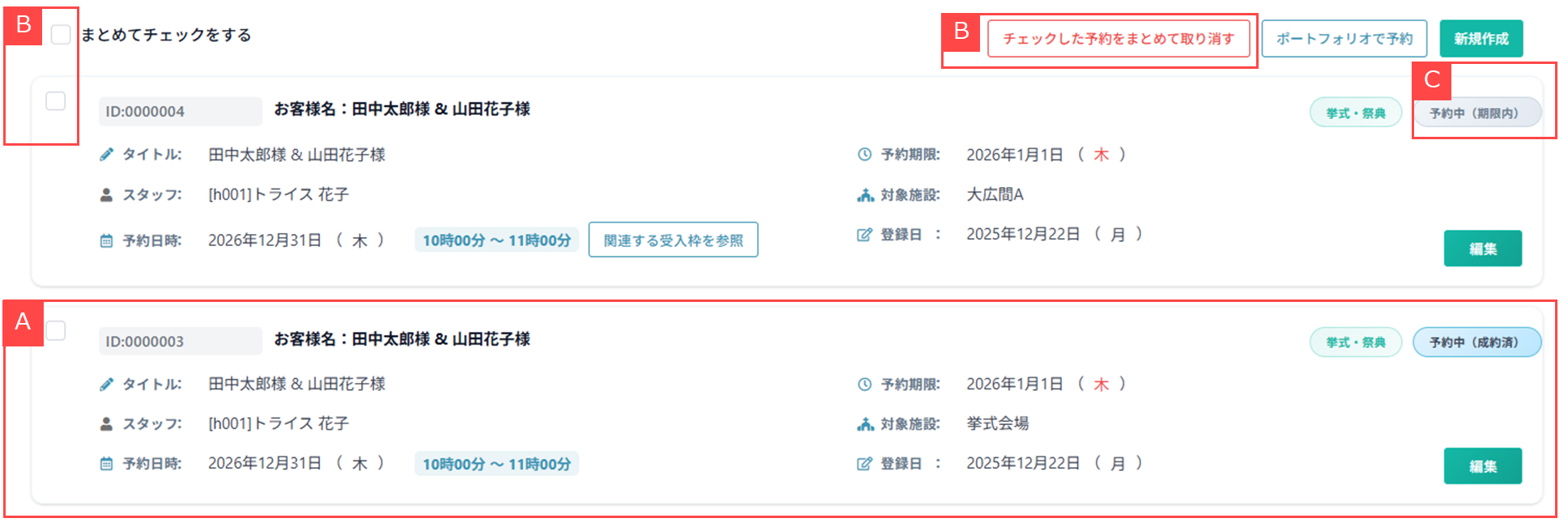 ③各施設予約データの右上に現在のステータスが表示されます。【C】