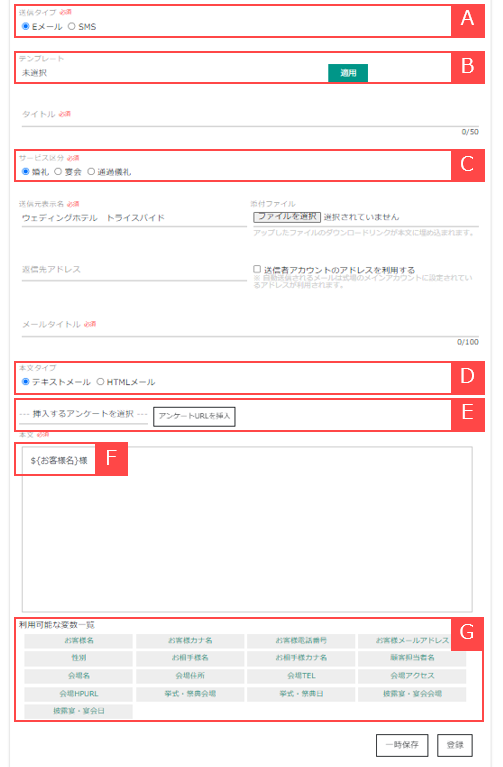 ⑦本文作成時に「${お客様名}」などの変数コードの設定が可能です。【F】