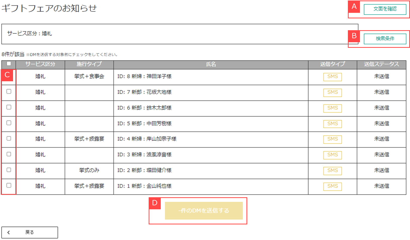 ④「-件のDMを送信する」とクリックすると設定に従いメールが送信されます。【D】