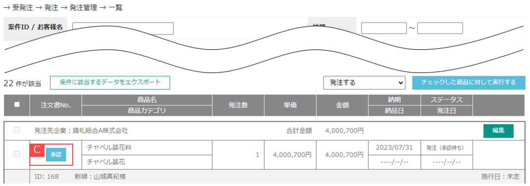 ②承認対象の商品が発注された場合、承認者のアカウントにのみ受発注>発注管理に「承認」ボタン