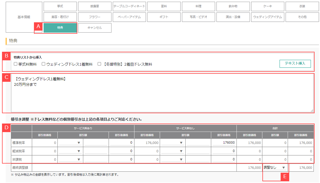 ①特典内容の登録、及び総額値引きが登録できます。【A】