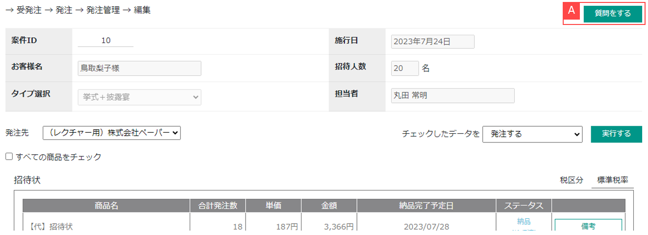 ②発注データの詳細画面を開き「質問をする」をクリックするとメッセージ送信画面が開きます。