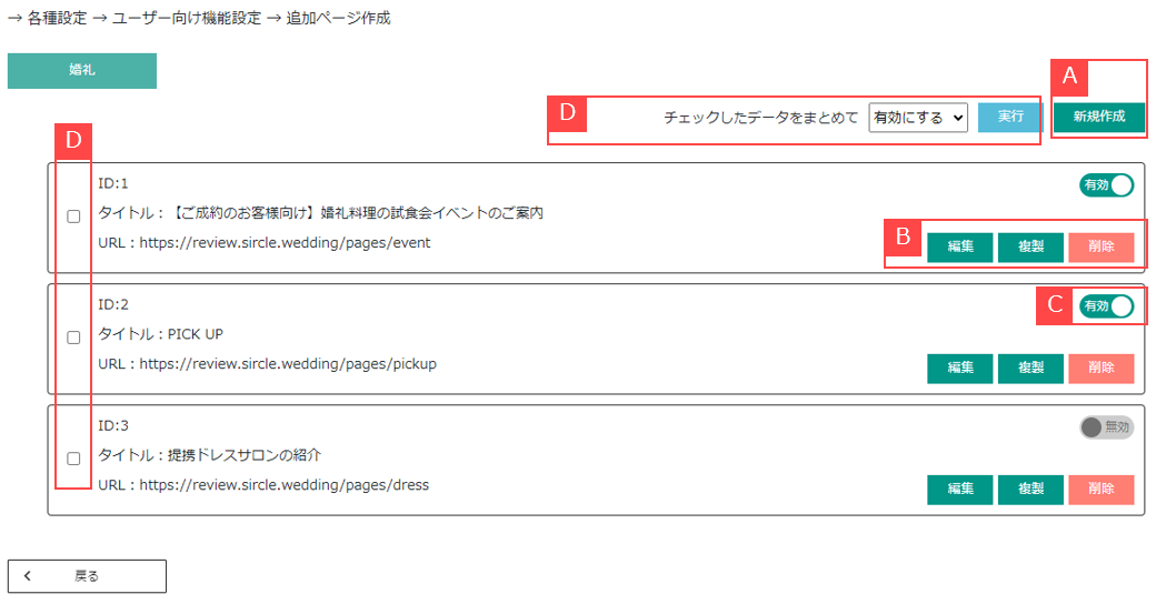②作成済の追加ページを複製、編集、削除できます。【B】