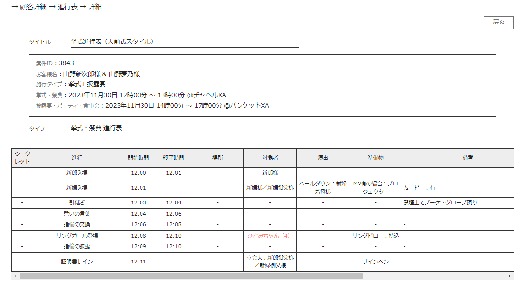 ①顧客ごとに施行当日の進行表の作成や、顧客専用に発行されたユーザーサイト画面での、顧客との