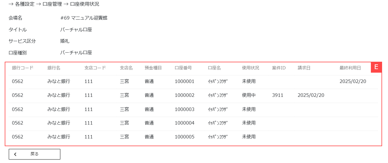 ⑥バーチャル口座の使用状況を確認できます。【E】