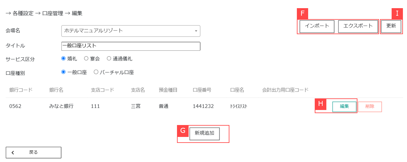 ⑩会場の口座情報を編集したら「更新」を押して設定を完了します。【I】