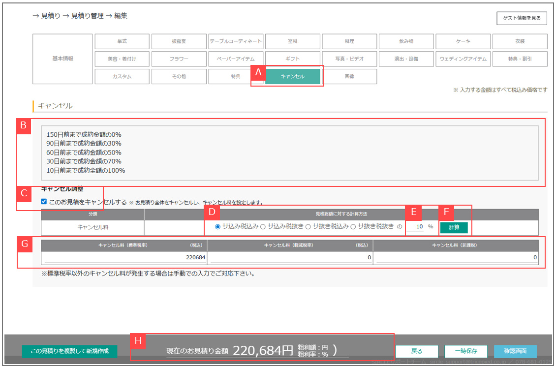 ⑤計算方法を選択し、キャンセル料の割合を入力すると自動計算できます。【D】【E】【F】