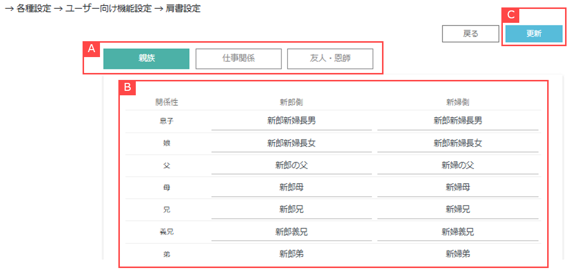 ①「親族」/「仕事関係」/「友人・恩師」の中よりグループを選択します。【A】